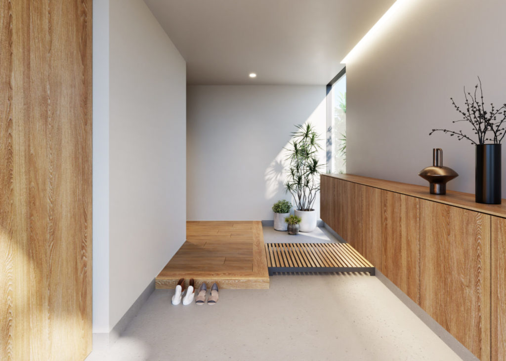 扉付きの収納を取り入れると、見た目がすっきりとして高級感のある玄関になります。また、玄関に座って靴を履くためのベンチを設置し、その下に引き出し収納を設けるのも効率的です。
